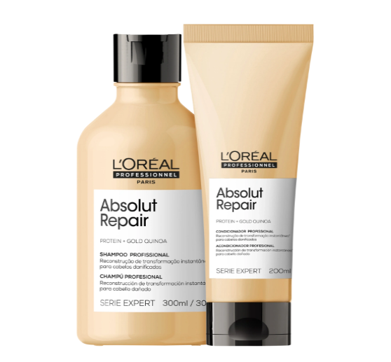 Kit para cabelos danificados. O Kit L'Oréal Professionnel Serie Expert Absolut Repair Gold Quinoa + Protein Duo oferece um cuidado diário que reestrutura a superfície dos fios, que ficam brilhantes, macios e leves.