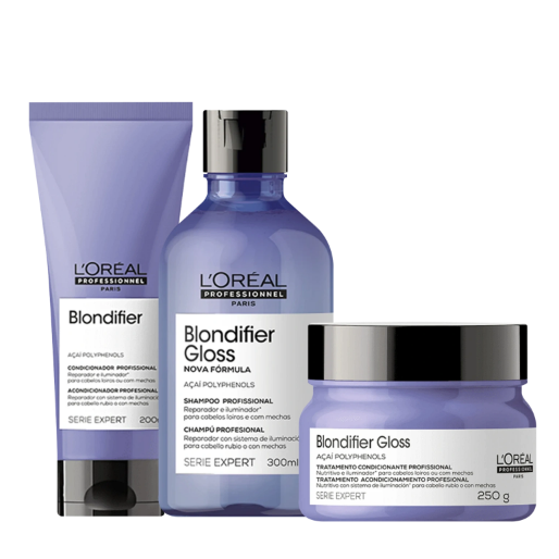O Kit L'Oréal Professionnel Serie Expert Blondifier Essential Trio conta com produtos que não podem faltar na sua rotina de cuidados com o cabelo loiro ou descolorido, essenciais para a limpeza e hidratação da fibra capilar.